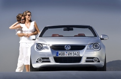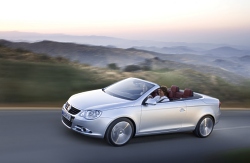 In addition, the CSC roof offers the general advantages of unimpeded suitability throughout the year and minimal driving noise when closed. It is also less appealing to vandals than a soft top. Of course, a roll-over protection system, which shoots out within a maximum of 0.25 seconds increases safety in critical situations. Very wide and powerful Dimensions: The convertible coupé is 1.79 metres wide, 4.41 metres long and 1.44 metres high. In relation to each other, these dimensions enhance the vehicle's dynamics. In comparison with its length and height, the vehicle's width lends the Eos a particularly powerful appearance. Its large track width (over 1.55 metres) not only looks good, it also contributes extensively towards the extraordinarily agile and safe handling characteristics exhibited by the Eos. The result is pure driving enjoyment regardless of whether the roof is up or down. Scheduled for launch in spring 2006 above the New Beetle convertible Market launch: The Eos is scheduled to be launched in Europe in spring 2006; the other continents are set to follow the same year. The car will open up a new sub-segment and will be positioned precisely between the A (Golf) and B class (Passat). In parallel, the New Beetle convertible, over 126,000 of which have been built and which underwent a facelift in 2005, will further extend its position as successor to the Golf convertible at the centre of the A class. Engines: Volkswagen makes specific use of technical synergies between its model series. Take the engines, for example: In detail, these encompass four petrol engines with outputs ranging from 85 kW / 115 PS, 110 kW / 150 PS and 147 kW / 200 PS to 184 kW / 250 PS plus a 103 kW / 140 PS TDI equipped with a diesel particulate filter as standard. Four-cylinder direct injection engines are fitted to provide outputs up to 147 kW, whilst the 184 kW variant derives its power from six cylinders. Sporty, elegant interior Passenger compartment: The interior design is also new. Whilst the functional and operating details (e.g. light, air conditioning, radio systems) are familiar from other models, many fundamental Eos elements are new developments. These include the cockpit, the door and side trim panels and the rear seat system. Volkswagen is additionally fitting electrically activated easy-entry seats for the first time: These "remember" the driver's and front passenger's longitudinal seating positions, and return to these – once the rear passengers have entered or exited the vehicle – at the push of a button. When the roof is open, a volume of 205 litres is available; when closed, 380 litres of stowage space are on offer. As standard, a power latching system closes the boot lid the last few millimetres. A through-loading aperture is additionally integrated into the rear bench seat. One equipment version, many equipment details Equipment: The Eos will be launched in just one high-quality equipment version. Permanent details fitted as standard will include ESP, safety-optimised front headrests, front airbags and specially developed side head-thorax airbags; 16" alloy wheels (V6: 17"), air conditioning system (Climatic / V6: Climatronic)), fog lights, electric window lifters, ambient lighting, leather-covered steering wheel*, gear lever knob* and handbrake lever* plus sports seats* (* = standard as of 103 kW, optional extras for 85 kW). Optionally, innovative features such as a Dynaudio sound system with ten-channel amplifier, ten loudspeakers and 600 W output power or bi-xenon headlights with dynamic and static cornering lights will be available for the Eos. September 12, 2005