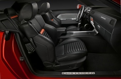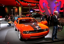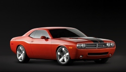 “During the development of the concept car,” says Micheal Castiglione, principal exterior designer, “we brought an actual 1970 Challenger into the studio. For me, that car symbolizes the most passionate era of automotive design.” Being key to the image, getting the right proportions was critical. The Challenger concept sits on a 116-inch wheelbase, six inches longer than the original. But its width is two inches greater, giving the concept car a squat, tougher, more purposeful persona. The signature side view accent line — designers call it the “thrust” line — is higher up on the body, running horizontal through the fender and door and kicking up just forward of the rear wheel. In section the upper and lower body surfaces intersect and fall away along this line, which has just a whisper of the original car’s coved surfacing. The five-spoke chrome wheels — 20-inch, front; 21-inch, rear — are set flush with the bodyside, giving the car the powerful muscular stance of a prizefighter eager to challenge the world. Wheel openings are drawn tightly against the tires, with the rearward edges trailing off. To emphasize the iconic muscularity, the designers added plan view “hip” to the rear quarters. One of the key characteristics of the original car the designers wanted to retain was the exceptionally wide look of both the front and back ends. To achieve this the designers increased both the front and rear tracks to 64 and 65 inches respectively, wider than the LX, wider even than the 1970 model. To realize the long horizontal hood the designers deemed essential, the front overhang was also increased. Both the hood and the deck lid of the Challenger concept vehicle are higher than the 1970 in order to lift and “present” the front and rear themes. The front end features the signature Dodge crossbar grille and four headlamps deeply recessed into the iconic car-wide horizontal cavity. Diagonally staggered in plan view, the outboard lamps are set forward, the “six-shooter” inboard lamps slightly rearward. At the rear, the car-wide cavity motif is repeated, encompassing a full-width neon-lit taillamp. Both the grille and the front and rear lamps are set into carbon-fiber surrounds. Like the original, slim rectangular side marker lamps define the ends of the car. Bumpers are clean (no guards), body-color and flush with the body. “This is something we would have loved to do on the original Challenger,” said Jeff Godshall, who was a young designer in the Dodge Exterior studio when the first Challenger was created, “but the technology just wasn’t there. With the Challenger concept, however, the Pacifica Studio designers are able to realize what we wanted in our perfect world.” The hood reprises the original Challenger “performance hood” and its twin diagonal scoops, now with functional butterfly-valve intakes. Designed to showcase the modern techniques used in fabricating the car, what look like painted racing stripes are actually the exposed carbon fiber of the hood material. The Challenger concept is a genuine four-passenger car. “You can sit up in the back seat,” said Castiglione. Compared to the original, the greenhouse is longer, the windshield and backlite faster, and the side glass narrower. All glass is set flush with the body without moldings, another touch the original designers could only wish for. The car is a genuine two-door hardtop — no B-pillar — with the belt line ramping up assertively at the quarter window just forward of the wide C-pillar. Exterior details one might expect, like a racing-type gas cap, hood tie-down pins, louvered backlite and bold bodyside striping, didn’t make the “cut,” the designers feeling such assorted bits would detract from the purity of the monochromatic body form. But tucked reassuringly under the rear bumper are the “gotta have” twin-rectangle pipes of the dual exhausts. In contrast to the bright Orange Pearl exterior, the interior is a no-nonsense, “let’s-get-in-and-go” black relieved by satin silver accents and narrow orange bands on the seat backs. “Though the 1970 model was looked to for inspiration, we wanted to capture the memory of that car, but expressed in more contemporary surfaces, materials and textures,” said Alan Barrington, principal interior designer. As with the original car, the instrumental panel pad sits high, intersected on the driver’s side by a sculpted trapezoidal cluster containing three circular in-line analog gauge openings. With its thick, easy-grip rim, circular hub and pierced silver spokes, the leather-wrapped steering wheel evokes the original car’s “Tuff” wheel, as does the steering column “ribbing.” The floor console, its center surface tipped toward the driver, is fitted with a proper “pistol grip” shifter shaped just right to master the quick, crisp shifts possible with the six-speed manual “tranny.” Inasmuch as the original Challenger was the first car to have injection-molded door trim panels (now common practice), the doors received special attention. Although the flat-section bucket seats of the original Challenger didn’t offer much support for aggressive driving, the front seats in the Challenger concept car boast hefty bolsters much like those found on Dodge’s famed SRT series cars. The trim covers’ horizontal pleats or “fales” provide just a hint of that “70’s” look. Rethought, reworked, reproportioned and redesigned, the Challenger concept car offers iconic a HEMI-powered performance coupe derived from a classic American muscle car. January 8, 2006