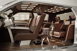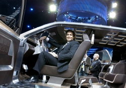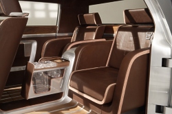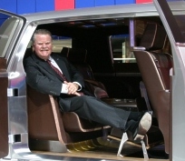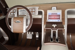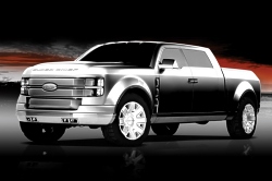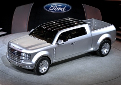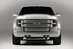 "The Tri-Flex fuel engine encourages the development of the hydrogen fuel infrastructure for the best future mobility solution," says Dr. Gerhard Schmidt, vice president, Research and Advanced Engineering. "It also drives the expansion of the domestic ethanol E85 fuel production and availability and, of course, provides our customers the convenience of gasoline until these other fuels become more readily available." The Tri-Flex system leverages existing powertrain technologies in which Ford has long held leadership. Since 1996, Ford has led in production and sales of flex-fuel E85 ethanol/gasoline vehicles. Ford has built more than 1.6 million flex-fuel vehicles that operate on any mix of E85 and gasoline. The Ford F-250 Super Chief epitomizes bold, American design and features an innovative Tri-Flex fuel engine that can run on hydrogen, E85 or gasoline. In December 2005, a flex-fuel capable version of the F-150 pickup went into production. Ford has committed to building more than 250,000 flex-fuel vehicles in 2006. Ford flex-fuel vehicles offer the customer convenience of filling one tank with E85 and/or gasoline. The transition from hydrogen fuel power to either E85 or gasoline is handled seamlessly through a dashboard-mounted switch and can occur while the vehicle is in operation. Transition from either E85 or gasoline to hydrogen requires that the vehicle be at idle to allow for proper engagement of the supercharger, which only operates when the vehicle is powered by hydrogen. Safe and Comfortable While the F-250 Super Chief has plenty of innovative tricks under its hood, it embraces several of Ford Motor Company's advanced safety technologies to help ensure that occupants' travels are not only comfortable, but also safe. Safety technology such as BeltMinder™ and BlockerBeam™ are among the innovative features on the F-250 Super Chief. BlockerBeam™ provides enhanced frontal crash compatibility with cars on the road, and Ford's patented BeltMinder™ technology will alert the driver when occupants are not buckled up. BeltMinder™ goes further than the federally required safety belt reminder chiming system. In Ford vehicles, the driver or front passenger who remains unbuckled is regularly reminded to buckle up. The system chimes and flashes a warning lamp for six seconds every 30 seconds for five minutes or until the driver buckles up, whichever comes first. The second-row BeltMinder™ technology will now be able to alert the driver when second-row passengers have not buckled their safety belts. In addition, Ford's unique frontal crash enhanced underride protection system – called BlockerBeam™ – could make the F-250 Super Chief more compatible with cars. The system helps F-250 Super Chief and a car better share energy during a crash. During a frontal collision with a car, the BlockerBeam™ is designed to make contact with the frame rails of a car in an effort to prevent the car from sliding beneath the higher-riding vehicle. Upon impact, the L-shaped brackets bend, helping to disperse crash energy. This reduces the amount of intrusion into the passenger compartment of the car and further reduces the risk of serious injury to the car's occupants. Bold, American Exterior Design The Ford F-250 Super Chief concept projects the next level of rugged elegance for full-size pickups, further stretching the world-famous F-Series lineup past the F-250 Super Crew and F-250 King Ranch. "Ford has been the truck leader for so long, no one can remember it being any other way," says J Mays, group vice president, Design, and chief creative officer. "The F-250 Super Chief boldly restates our leadership with a quintessentially American truck." The F-250 Super Chief's locomotive-inspired front-end appearance sets the tone, complemented by its bold, imposing grille. The pattern of the headlamps echoes the motif of the interior's coffered ceiling, with five-element/four-emitter LEDs behind the optics. Below the headlamps, sturdy tow hooks are integrated into the fog lamps for a multifunctional look. Even more pronounced from the profile is the truck's substantial cabin. Based on an F-250 Super Duty with an 8-foot-long bed, F-250 Super Chief designers reallocated 2 feet of bed space for the passenger compartment, which is accessible through center-opening doors. The F-250 Super Chief's rear doors can be opened independently of its front doors. An electronic release first extends the rear three-pivot hinges out and slides them back slightly to open the rear doors; an electronic motor pulls them closed. The F-250 Super Chief features patent-pending rear-hinged rear doors that can open independently of the front. Also visible are the coffered glass ceiling and wood-planked cargo bed. Expressive details add beauty as well as functionality. The sculpted cowling serves as an air intake for the V-10 engine, while pronounced vents exhaust heat from the engine bay. Pronounced flares house the truck's 24-inch wheels, and Goodyear tires firmly plant the truck on the ground. In the rear, the tailgate hinges on both sides for greater utility. Inside the bed, a wood-planked bed floor is ribbed with raised metal rub strips for easy cargo loading. In addition, there's an under-bed storage tray, which can be accessed even when the cargo bed is full. Interior Indulgence The F-250 Super Chief concept delivers an interior design that's rugged as well as elegant in three materials: American walnut, brushed aluminum and rich brown leather. "Well-appointed vehicles are nothing new," Mays says. "But, as premium amenities and finishes become more ordinary, we wanted to push the envelope and show our truck customers – and our competitors – what a truly upscale, distinctly American pickup might look like." The entire roof of the F-250 Super Chief is glass, bisected by a leather-wrapped grid of American walnut, allowing vista views. The walnut, outlined in aluminum, lines the truck's floors as well, carrying through t