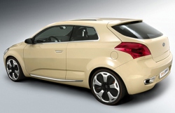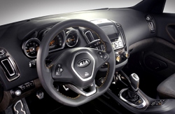 The wheels are a two-part design, featuring five double-spokes arranged with a recessed black power-coated centre and brightly polished convex perimeter spokes. These dramatic wheels sport 265/30 R19 low profile tyres. Key attributes which the pro_cee’d and ‘sporty hatch’ models will have in common include the lowered roof line (down by 25 mm compared to the five-door cee’d) and shallower side windows ringed in chrome trim that create a robustly sporty window graphic. The pro_cee’d interior is designed to accommodate four people and is trimmed to give a strong ‘performance’ feeling with deeply matt surfaces. Like the exterior, the cab uses bright metal and dense matt black elements, but in the interior these appear to ‘float’ amidst areas of contrasting leather trim. Facing the driver, the three recessed dials of the instrument panel have separate metal cowlings set beneath a top cowling that also appears to ‘float’ above the dashboard. The short, leather-shrouded gear lever is set in a bright metal surround topping a black centre console that rises between the front seats to position a battery of minor switchgear within easy reach of the driver. In Paris, Kia will unveil its all-new C-segment estate model, the cee’d ‘sporty wagon’ prior to its launch in mid-2007.