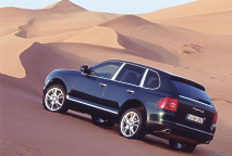 Porsche Stability Management (PSM), also standard on Cayenne, maintains a constant dialogue with PTM but only intervenes when the vehicle reaches its physical limit. Coordinating essential systems such as the anti-lock brake system (ABS), the automatic slip regulation (ASR), and the automatic brake differential (ABD), PSM is immediately available whenever the Cayenne enters critical over- or understeer conditions, "telling" PTM to open the differential locks in order to re-stabilize the car by applying the brakes specifically on individual wheels. Sporting and agile on the road; robust when driving off the beaten track The suspension provides the secure foundation for supreme driving dynamics combining optimum safety, motoring comfort and off-pavement driving capabilities. The front axle, which is newly developed for the Porsche Cayenne, is an extra-large double track control arm configuration mounted on its own subframe. The large distance between the individual track control arms keeps forces acting on the suspension to a minimum, thus ensuring precise wheel guidance for supreme agility and an extremely low level of any adverse forces. Incorporating extra-large rubber mounts, the elastic subframe bearings additionally serve to keep out any road noise with maximum efficiency. Made of high-strength steel, the subframe design has an arch-shaped crossbar and inclined ramps at the front that give the Cayenne ample ground clearance of up to 273 mm, or 10.75 inches. The steering transmission with its variable transmission ratio and the differential are both well protected on top of the subframe to help guarantee robust off-pavement driving qualities. The rear axle is another new Porsche development. The rear axle configuration is an elaborate multi-arm concept easily able to handle both high traction forces and the Cayenne's high service load capabilities. In the interest of extra comfort and noise reduction, the rear axle is also mounted on a subframe resting on extra-large, hydraulically dampened rubber bearings. Again, the subframe is made of high-strength steel for optimal weight and maximum structure stiffness. The lower track control arm and the tie-rod are both made of steel plate to ensure robust strength even on the roughest surfaces. The upper track control arm assembly, which is well protected within the vehicle, is made of extra-light forged aluminum components. Through its particular configuration, the axle kinematics reduces undesired squat and dive when accelerating and braking, keeping the Cayenne almost entirely level on the road at all times. The rear axle configuration and the rear toe-in control stabilize the vehicle's driving behavior particularly in bends and under load change. A special feature of the axle concept is the extra-long spring travel for off-pavement purposes. The pneumatic spring suspension, standard on the Cayenne Turbo, comes with inward and outward spring travel of 102 and 118 mm (4.02 and 4.65 inches), respectively, on the front axle, and 124 and 125 mm (4.88 and 4.92 inches) at the rear. Inward and outward spring travel on the steel spring suspension of the Cayenne S is 104 and 116 mm (4.09 and 4.57 inches), respectively, at the front and 135 and 98 mm (5.31 and 3.86 inches) at the rear. As an option, the Cayenne S is also available with pneumatic, air-controlled spring suspension. Pneumatic suspension with self-leveling and adjustable ride height Pneumatic suspension not only guarantees extra ground clearance on rough terrain, its self-leveling feature provides a consistent vehicle position regardless of the load. The system also ensures maximum driving pleasure and active safety by automatically lowering the Cayenne relative to increasing road speed. Incorporating six different ride height levels, the pneumatic suspension adjusts over a range of 116 mm (4.57 inches). Active damper control Porsche offers pneumatic suspension in combination with Porsche Active Suspension Management (PASM), a new variable damping system. Operated electronically, PASM adjusts damper forces infinitely as a function of surface conditions and the driver's driving style. A typical example of PASM intervention is during powerful application of the gas and/or brake pedal or when driving on particularly rough terrain. PASM serves to steady any body sway and dive motions by monitoring body movement through five accelerometers. As soon as the motion of the Cayenne's body exceeds a certain limit depending on specific driving conditions, PASM intervenes and stabilizes the vehicle by acting on the individual dampers. Save traction even on the roughest terrain As an option, Porsche offers the Advanced Offroad Technology Package for the most extreme off-pavement conditions. Apart from special side protection and a steel plate underfloor panel around the radiator, this package includes a fully controllable (up to 100 percent) differential lock on the rear axle. To fully activate the lock, the driver operates the central off-pavement switch a third time. The fully controlled rear axle lock then ensures even better traction when setting off on slippery surfaces with varying frictional coefficients and in bends. The package also uses anti-roll bars on the front and rear axle, which are hydraulically activated and deactivated by a switch in the center console. This increases front and rear axle lock by 70 mm or 2.76 inches, which improves ride comfort by minimizing body sway and enhancing off-pavement driving qualities and traction when negotiating rocks, tree trunks or bumps. To ensure the Cayenne's sporting driving qualities on the road, the anti- roll bars can only be disconnected in the low range mode. As soon as the Cayenne, with its anti-roll bars disconnected, returns from rough terrain to the road, the anti-roll bars are automatically reconnected once the vehicle exceeds 50 km/h or 31 mph to provide the additional stability required for on- pavement driving as a safety feature. Fea