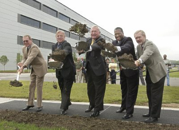 Dirt flies as (L-R) General Motors' Executive Director Bill Whitley, Facilities, GM Vice President Ed Koerner, Powertrain, Oakland County Executive Brooks Patterson, Pontiac, MI Mayor Willie Payne and David Hollister Michigan Department of Labor and Economic Growth, break ground Thursday, July 22, 2004 on a $385 Million engineering facility at GM's Powertrain Headquarters. (Photo: Joe Polimeni/General Motors) PONTIAC, Mich. - GM and government officials broke ground on a $385 million engineering facility at GM Powertrain's headquarters site here. The new facility will consolidate 1600 jobs, or most of GM's Michigan powertrain engineering and laboratory operations, into the Pontiac site. Business areas affected include component and dynamometer lab operations and transmission, diesel and hybrid engineering. GM Powertrain's current Michigan operations include transmission engineering and testing in Ypsilanti, diesel engine engineering and testing in Romulus, hybrid propulsion systems engineering and testing in Troy, engine testing in Warren and component testing in Wixom. GM Powertrain vehicle integration and emissions testing remains at GM's Milford Proving Ground. GM expects this move to make its operations more efficient and competitive. "It is partnerships like these that keep GM continuing to invest in the state of Michigan, Oakland County and the city of Pontiac. The consolidated powertrain engineering operations will allow GM to provide flexible engineering development tools to bring new, robust powertrain technologies to market at an ever-increasing speed," said Ed Koerner, vice president of engineering for GM Powertrain. Construction is expected to be complete by late 2007. Koerner was joined at the ground breaking ceremony by Director David Hollister of the Michigan Department of Labor and Economic Growth, Oakland County Executive L. Brooks Patterson and city of Pontiac Mayor Willie Payne. The state granted GM a Brownfield Redevelopment Single Business Tax credit and a state air permit for the $385 million investment. The city of Pontiac granted GM tax abatements allowed under Michigan state law for the investment. "This investment is wonderful for Pontiac's long-term economic prosperity. GM has always been a great corporate citizen and we look forward to seeing the benefits as a result of this investment," said Mayor Payne. (July 22, 2004)