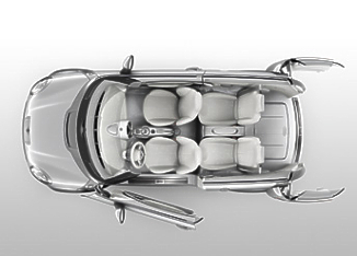 The fundamental idea in developing MINI Concept Frankfurt was to make loading and entering the car as simple and convenient as possible. This is why all four doors (the driver/front passenger and rear doors) come with parallelogram kinematic joints and springs: To allow optimum access and entry into the car, the doors swivel to the side and at the same time to the front in one single movement, ensuring maximum opening space leading into the interior. The rear sliding windows open electrically, the front section moving parallel beneath the rear half. With the windows fully open, MINI Concept Frankfurt thus provides a particularly impressive feeling of style and generosity otherwise to be found only in a coupé and convertible. And thanks to the long wheelbase, the two rear seats are easy to reach while at the same time the exterior of the car offers a particularly dynamic and sporting impression. Cargobox in the Luggage Compartment, Large Loading Area in the Roof The MINI Concept Frankfurt comes with an adjustable Cargobox within the luggage compartment with its loading cover moving out to the rear for easy and convenient access at all times. A further convenient feature is the transparent cover on the Cargobox moving up and thus serving as a partition between the passenger area and the luggage compartment. The rear section of the roof, finally, opens up just as conveniently for easy loading. Satellite Silver Metallic Paintwork and Neoprene Contour MINI Concept Frankfurt stands out in its beautiful silver paintwork in the light, all points not directly in the beholder's line of vision being kept in a more discreet grey. Soft, resilient neoprene is featured on the black side band so characteristic of the car, extending along the side-sills and wheel cutouts. Interior Design Characterised by "Floating Elements" The "Floating Elements" concept consistently takes up and continues the car's exterior statement within the interior: Right from the start when getting into the car, MINI Concept Frankfurt makes a generous and open impression enhanced by the completely free and accessible floor of the car, the foot area covered only by the central "insular element" of the centre console holding the "suspended" seats in position to provide a particularly generous foot area with a very advantageous impression of space. This impression is further accentuated by the free-hovering dashboard with its speedometer in the middle. It almost goes without saying that MINI Concept Frankfurt offers adequate space for four. The rear-seat backrests tilt down individually to form a flat surface flush with the floor of the luggage compartment, while the centre armrest lying between the two seats is integrated in the flat surface and offers additional storage space. Leather, Chrome and Aluminium as the Principal Materials Throughout the interior, white leather underlines the impression of modern style and generous space, adding a strong touch of sophisticated class and stylish flair. The colour white emphasises the clear lines of MINI Concept Frankfurt, top-quality leather being used on different surfaces, the warm, natural surfaces being supplemented by cool-looking, metallic trim at all appropriate points. An aluminium-coated glass-fibre structure, for example, accentuates the door panels and linings inside the car, while a special carbon-fibre look highlights the foot area in combination with nylon texture carpeting adding a particular touch of sporting style. Forty-Five Years of the Mini Traveller