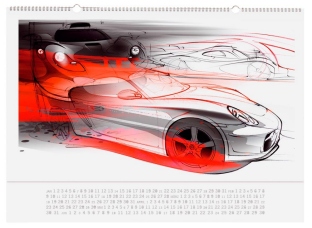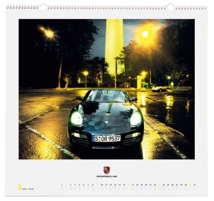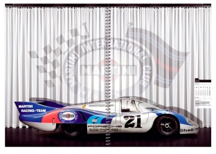 In 2008, the historical calendar presents the legendary 917-type racing cars at their various development stages from 1969 to 1972. In 1970, a 917 secured the first overall victory for Porsche in the 24 Hours of Le Mans and thus made motor-sport history. A spiral binding divides the 30 x 42 centimeter large historical calendar (60 x 42 centimeters when opened out) vertically down the middle. When placed in the slip case provided, the calendar becomes an illustrated collectors’ book that will long outlast the year 2008. Again, it costs 34.51 Euro*.