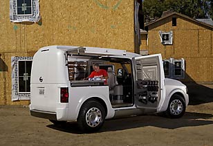 But imagine the case a marine biologist/photographer. When setting off on an expedition, he or she might take along a mountain of equipment – including underwater cameras and lights, scuba diving equipment, an underwater scooter, computer equipment for downloading digital images, mobile communication equipment to send the images to clients or research centers, clothing, food and water, and perhaps camping or overnight gear. This is typically enough equipment to fill a van, with little space left over for an on-site office. That’s where innovation comes in. A Unique Slide-Out Cargo Pod At the heart of Nissan NV200 is a patented sliding cargo pod, which is divided into a number of separate areas where different pieces of diving and photographic equipment can be stored. The pod is latched inside the shell of the load area when the van is being driven. Upon arrival at its destination, it slides out rearwards to allow easy access to the storage zones. The pod is deployed manually with the aid of hydraulic rams, and sits securely on integrated “drop-down” legs when fully extended. As the pod is withdrawn from the van, the area left behind is transformed into a mobile office and IT dock. A computer table drops down from the side of the van to reveal two LCD screens upon which images can be edited. The front passenger seat swivels backwards on a single curved rail to face the table. Along with housing diving gear in separate “wet” lockers, the pod holds four air tanks and there's a specially shaped area to securely hold the underwater scooter. Lockable roller blinds protect the contents, while valuable camera equipment can be accessed either from within NV200 or from outside the pod. From the outside, NV200 is the epitome of a modern van. A cab-forward design, the wraparound grille blends into upswept lines on either side of the cabin. Dramatically rising side windows accentuate a high waistline and underline the van's practical, load carrying ability. The NV200 sits on a long 111.4-inch wheelbase and is 72.4 inches tall, providing a practical, roomy load space. When the pod is deployed, solar panels built into its roof are directly exposed to daylight. But even when the pod is pushed back into the van, the panels line up beneath the NV200’s large skylight. In this way, power can be generated in daylight hours, whether the vehicle is stationary or not.
