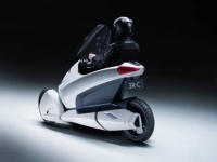 This revolutionary three wheeled battery electric vehicle concept shows what a future minimal urban transport vehicle for one person might look like. The battery electric drivetrain, is mounted low in the three wheeled chassis, therefore keeping the centre of gravity low and thus improving stability. The 3R-C has a clear canopy that covers the driver's seat while it is parked and not in use. When the three wheel vehicle is in motion, the canopy becomes an enveloping wind-shield that provides the pilot, who sits low in the chassis, with significant protection. The high sides of the safety shell seat give greater safety to the occupant, reducing the threat from side impacts and improving weather protection. In front of the driver is a lockable boot area, which gives significant secure storage for luggage or other items. The 3R-C's designers created a flexible cover that surrounds the upper torso to reduce exposure to bad weather and improving comfort. The Honda CR-Z sporty hybrid coupe