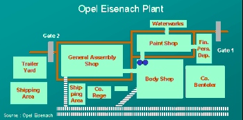 As in many other GM/Opel plants, seats are delivered in line sequence by automatic transportation, delivered directly to the location at the line, where the seats are mounted.