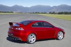 Distinguished by its eye-catching oversized grille, the front visage borrows design cues from a jet fighter to hint broadly at the huge quantities of air it draws in and at the car's road-hugging stability. The brand-identifying 3-diamond logo on the leading edge of the engine hood is another distinguishing element of the new-age Evolution design. The simple and functional layout of the cockpit is put together in a design that encourages the driver to concentrate fully on operating his machine. The design team has spared no effort in developing coloring and lighting that engender a keener competition look to the interior. The black keynote interior color uses silver counterpoints to impart the material look of aluminum and create a more dynamic and athletic looking interior space. Powertrain MITSUBISHI Concept-X is powered by a 2.0-liter 4-cylinder DOHC MIVEC intercooler-turbocharged engine that delivers instant response at all engine speeds with flat torque that keeps pulling up to the red line. MITSUBISHI Concept-X uses a clutchless 6-speed auto-manual transmission that realizes slicker shifting and higher transmission efficiency than a regular manual gearbox. Paddle shifters mounted on the steering column allow the driver to concentrate on his steering better and enable drivers of all abilities to experience the satisfying pleasure of sport driving. Body and chassis The ring-structure frame design realizes a significant increase in body stiffness, while the use of aluminum in the engine hood, trunk lid, fenders, roof and front and rear door panels reduces weight. Reducing weight in the roof and upper parts of the body lowers the center of gravity, while weight reduction in the doors, engine hood, trunk and other peripheral elements reduces the moment of inertia for better steerability. Weight reduction, lowering the center of gravity and reducing the moment of inertia all contribute to better motive performance and better handling. The suspension features a MacPherson strut at the front and a multi-link arrangement at the rear. Working in concert with Mitsubishi Motors' "Roll Control Suspension" technology, this design delivers very high levels of ride and road holding. On-board Multi-Media System The On-Board Multi-Media System complements the interior design in the way it encourages a dialogue between driver and machine. The high-definition LCD monitor provides a real-time display of vehicle and S-AWC operating status while also displaying on-board navigation system maps and DVD audio controls. Rear seat passengers have their own LCD displays at the back of the front seats that allow them to share with the driver driving-related information and to share the fun-to-drive experience. Super All Wheel Control (S-AWC) MITSUBISHI Concept-X showcases Super All Wheel Control (S-AWC) vehicle dynamics control technology. A further step up the evolutionary ladder of Mitsubishi Motors four-wheel drive traction and handling technology well proven in the Lancer Evolution and other series, S-AWC realizes cutting-edge levels of vehicle dynamics control. Based on Mitsubishi's full-time 4WD system, as used in Lancer Evolution, that is built around ACD3 and Super AYC4 component technologies, S-AWC adds Active Brake Control, Active Steering System and Roll Control Suspension technologies to realize a fully integrated system. Oct 20, 2005