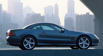 As the power roof retracts, the rear window glass also rotates so that its curvature nestles inside the stowed roof panel, providing a surprisingly large cargo area of 6.8 cubic feet. With the top up, the trunk holds 9.7 cubic feet -- over 1.8 more than its predecessor. A hydraulic pump and 11 computer-controlled hydraulic cylinders power the system, and top operation is controlled by a distinctive switch on the center console. When the top is stowed, pressing a red button located inside the trunk raises the folded roof about 20 degrees, making cargo access easier. Leaner, Cleaner, Stronger and Sleeker A five-liter V8 engine -- one of the most potent in its class -- produces 302 horsepower, accelerating the new SL500 from 0 to 60 mph in approximately 6 seconds. Advanced twin-spark-plug, three-valve-per-cylinder technology also means the new SL500 is a ULEV, or Ultra Low Emission Vehicle. Sparkling performance is due in part to the SL sports car's sophisticated, lightweight body. The hood, doors, trunk lid and roof are all aluminum, and the front hood alone is 33 pounds lighter than a comparable steel hood. At the same time, over 30 percent of the body structure is made of high-strength steel, so that the new SL body is 20 percent stiffer than the previous model, even with the top down. The aerodynamic shape of the SL body contributes its impressive performance and fuel efficiency as well as to a quiet cockpit. The drag coefficient is 0.29 -- greater than nine percent lower than the previous model. (July 31, 2001) [Homepage] [