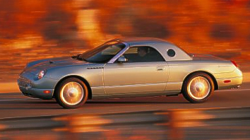 Photo: Ford DEARBORN, Mich. – The long-awaited rebirth of an American icon took one more step toward becoming a reality today. Ford CEO Jacques Nasser announced that the first shipment of 2002 Ford Thunderbirds will leave the Wixom (Mich.) Assembly Plant next week, heading to Ford dealerships and customers. Nasser made the announcement at an employee and enthusiast event at Ford World Headquarters to celebrate the people of Thunderbird. Today's Thunderbird celebration was one of the largest gatherings of classic Thunderbirds in history. "Today is the start of a new chapter in automotive history, as the first two-seater Thunderbirds in 40 years are poised to begin their journey to those who have been waiting for the return of this American dream car," said Jim O'Connor, Ford Division president. "This car, its style, the statement it makes, the feelings it evokes – all will make it an icon in its own right." Ford officially opened the order banks for the 2002 Thunderbird on Jan. 8, 2001, the day the production car made its debut at the North American International Auto Show in Detroit. Thunderbird, a modern interpretation of the classic roadsters of the '50s and '60s, will begin appearing in dealer showrooms in the next few months. At the Thunderbird Celebration, William Clay Ford, Jr., great-grandson of Henry Ford and chairman of the board of Ford Motor Company, presented the keys to the first production 2002 Thunderbird to Steven K. Hamp, President of Henry Ford Museum and Greenfield Village. The car, a black convertible with red-on-black interior, carries serial number 00001, and will be preserved for history at the museum. Available in five colors -- Inspiration Yellow, Thunderbird Blue, Torch Red, Whisper White and Evening Black -- Thunderbird expresses a bold, confident and free feeling in a two-seat convertible roadster – a modern tribute to another optimistic American era. Thunderbird features obvious visual cues that tie it to the classic cars of the past, but with a decidedly modern interpretation. It comes standard as a convertible and also is available with an optional removable top with classic porthole windows. The removable top weighs 83 pounds for easy removal and installation. A secure pin-and-bolt system at the two front attachment points and two clamps at the rear connect the removable top to the car. The two-person interior reflects the exterior design and the car’s romantic heritage with bold style combined with comfort and convenience. Thunderbird is in a class by itself as a 107.2-inch wheelbase rear-wheel-drive roadster with a smooth, free-breathing 3.9-liter V-8 engine. Ride and handling are specially tuned, and structural braces under the car enhance the chassis rigidity, giving the roadster impressive driving dynamics. (July 20, 2001) [Homepage] [