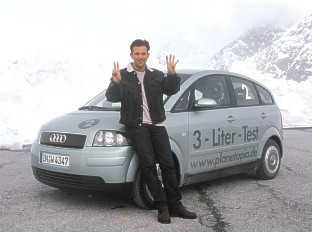Frank Jendrek and the Audi A2 TDI Photo: Audi Ingolstadt - A car’s fuel consumption under standard test conditions is usually little more than a theoretical value. Now it has been shown, however, that a car can actually improve on this value in normal road conditions. In order to establish just how little fuel the world’s first five-door ”three-litre” car genuinely needs, the "Planetopia" programme broadcast by TV channel SAT1 despatched the Audi A2 1.2 TDI (45 kW/61 bhp, standard test consumption of 2.99 litres/100 km) on a journey such as never been tackled before. Of the 700 people who applied to take part, two were chosen and invited to drive the car as economically as possible from the Dutch town of Scheveningen to the foot of a glacier in the Tyrol. The two amateur contenders, Inge Sternath and Frank Jendrek, were up against a fuel-saving expert Gerhard Plattner, who was at the wheel of a more powerful Audi A2 1.4 TDI (55 kW/75 bhp, standard-test fuel consumption 4.3 l/100 km). All three cars were absolute production models, the only addition being a special computer to register the fuel consumption with extreme accuracy. The result after completing this 1114 kilometre run from the North Sea coast to the edge of an Alpine glacier: Frank Jendrek averaged just 2.40, Inge Sternath 2.44 and Gerhard Plattner 3.29 litres per 100 kilometres. Converting these figures into percentage improvements on the standard-test fuel consumption actually makes Plattner, an old hand at economical driving, the winner. He improved on the test figure by 24 percent, his amateur challengers by 20 and 17 percent. (May 16, 2001) [Homepage] [