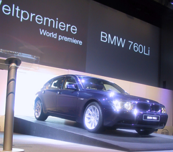 BMW 760Li Photo: Automotive Intelligence Munich - "In terms of performance, driving dynamics and luxurious comfort, the BMW 760Li will set new standards in the 12-cylinder luxury sedan segment, significantly outperforming its competitors also in terms of fuel economy", stated Dr Burkhard Göschel, Member of the BMW Group Board of Management for Development and Purchasing, at the presentation of the top model within the new BMW 7 Series at the BMW Group Press Conference in Frankfurt. Dr Göschel emphasized that this is the first BMW to feature direct gasoline injection supplementing VALVETRONIC technology. The combination of these top technologies allows unparalleled fuel economy, on the one hand, plus supreme specific torque and output, on the other. Contrary to GDI engines incorporating a lean-burn concept and a Denox catalytic converter, the BMW VALVETRONIC+DI concept with lambda=1 emission technology offers the big advantage of being suitable for use worldwide, regardless of the level of sulphur in the fuel available, without any increase in fuel consumption. The all-new V12 aluminum engine in uncompromising 60° configuration will displace 6.0 liters, developing maximum output of more than 408 bhp and maximum torque of approximately 442 lb-ft. Like the new V8 power units, this new 12-cylinder features not only BMW's innovative VALVETRONIC technology responsible to a large extent for the superior fuel economy of the 760i, but also four-valve technology and fully variable bi-VANOS camshaft control. The BMW 760i/760Li is to be launched in autumn 2002. (September 11, 2001) [Homepage] [