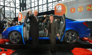 Photo: GM Saturn ION Revealed: General Motors President of North America Gary Cowger(L) and Saturn's Vice President of Marketing Jill Lajdziak(C) pose with the new Saturn ION March 27, 2002 after it was unveiled at the New York Auto Show. The Saturn ION, new from the ground up with a new name, replaces the Saturn S- series. Blending innovative thinking, segment-leading features and unprecedented personalization opportunities, the 2003 Saturn ION sedan and quad coupe deliver excitement and value uniquely tuned to the needs of small-car buyers. The new series of ION cars will debut in the fourth quarter of 2002. The two ION models are completely new from the ground up and offer surprising refinement for the small-car segment. Even the name is new, since they replace the pioneering S-Series in the Saturn lineup. Both the four-door sedan and the "quad coupe" - so-called because of its dual rear-access doors (RADs) - are built on the new General Motors Delta global small-car architecture. The quad coupe's dual RADs represent an industry first, resulting in the creation of a new category of vehicle and a new, more functional small car. "The ION sedan and quad coupe are going to re-energize the small-car arena," said Jill Lajdziak, vice president of Saturn sales, service and marketing. "These new models bring surprising levels of personalization and customer-friendly features to the segment, including a larger exterior, more interior room, a new powertrain, and enhanced ride and handling." Attracting younger buyers The new models also will play an important role in GM's entry-level strategy to attract more young buyers by providing a selection of vehicles with high value and fresh designs. One of the keys to attracting young buyers will be an emphasis on making it easy for customers to personalize their vehicles through "personal accents" kits. Planned exterior customization includes interchangeable roof rails that are color-coordinated with interior trim kits consisting of bezels for the center-mounted instrument panel, shifter and HVAC control panel. Saturn also plans to offer a full range of retailer-installed accessories when the IONs are introduced. Another important plus for young buyers is that both the ION sedan and quad coupe will have significant safety content - a hallmark of the Saturn brand. The ION small cars continue the ongoing revitalization of Saturn's product portfolio, which for 2003 also includes the VUE compact sport-utility vehicle and the refreshed L-Series mid-size sedan and wagon. The ION will be built along with the VUE in a partial split-line arrangement at Saturn's manufacturing facility in Spring Hill, Tenn. Like all Saturns, the ION sedan and quad coupe will be sold and serviced through Saturn's award-winning network of retailers who are recognized leaders in satisfying customers. Saturn retailers have finished number one in the J. D. Power and Associates Sales Satisfaction Index for six of the last seven years. Distinctive siblings While siblings, the sedan and quad coupe use distinctive exterior styling cues, but leave little doubt that both are Saturn family members. The ION sedan brings a refined, sophisticated, contemporary look to its segment. Meanwhile, the quad coupe creates an entirely new product category by incorporating rear-access doors on both the driver and passenger side and an overall sporty flair. Both vehicles continue the Saturn tradition of polymer side panels, including the integral upswept "swoosh" body side styling. Inside, a unique feature is the incorporation of a center-mounted instrument cluster. This innovative styling cue not only makes the sedan and quad coupe more distinctive, but also enhances the driving experience by helping keep the eyes closer to the horizon. In addition, positioning the instrument cluster in the center allows the driver to comfortably position the steering wheel, without having to position it to read instrument gauges. The center-cluster design made it possible to give the ION a unique, small diameter steering wheel, part of an interior design that focuses on harmony and overall refinement. Other examples include tactile surfaces throughout, thin structural A-pillars, and a sloped center console to enhance the perception of airiness while improving ergonomics and visibility. New architecture Built on GM's all-new Delta architecture, the five-passenger sedan and four-passenger quad coupe continue Saturn's traditional spaceframe construction. The new architecture allows the ION models to be substantially bigger than their predecessors - approximately 2 inches taller and 6 inches longer - providing a more significant command of the road. In addition, a wider track (approximately 2 inches front and rear) and longer wheelbase delivers a more substantial presence. The new, stiffer Delta architecture leads to significant improvements in noise and vibration, as do hydraulic engine mounts, dual balance shafts on the Ecotec powerplant, and enhanced noise dampening throughout the vehicle. On the inside, the seating position is significantly higher for both front and rear occupants, improving entry and egress and providing a more commanding view of the road. The quad coupe is equipped with "fold-flat" passenger front and rear seats for enhanced functionality to the small-car market. Both models feature significant interior storage, including three bins in the instrument panel, CD storage in the console, and map pockets in both the front and rear doors. In addition, the ION sedan is expected to have the most trunk room in its class - and the quad coupe's dual RADs and fold-flat seats bring so much versatility that even items such as a stepladder, or even a small kayak, can be toted in its interior compartment. Small-car market The Saturn ION sedan and quad coupe will compete in a small-car market that accounts for sales of more than two million units per year, about 14 percent of the total U.S. new vehicle market. Approxim