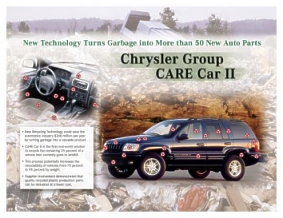 Photo: DaimlerChrysler Auburn Hills, Mich. - Innovative recycling technology shown for the first time in Chrysler Group's CARE Car II turns garbage into a valuable product while potentially saving the automobile industry $320 million per year. The CARE Car II is the second phase of the Chrysler group's CARE (Concepts for Advanced Recycling and Environmental) Car demonstration program. The goals of the program are to increase the recyclability and recovery of automobiles to about 95 percent by weight and increase the use of recycled materials in production vehicles. "This project demonstrates that the industry can 'care' for the environment while protecting the bottom line," said Bernard Robertson, Senior Vice President of Engineering Technologies and Regulatory Affairs. "Automobiles are already one of the most recycled products on the planet, but this technology presents the first real world solution to recycle the remaining 25 percent of a vehicle that still goes to a landfill." Chrysler Group worked with 26 production suppliers and Salt Lake City based Recovery Plastics International (RPI), to retrofit two Jeep® Grand Cherokees with 54 recycled plastic parts. Chrysler Group was the first automaker to use RPI's proprietary plastic flotation technology to separate the myriad of plastic types found in automotive shredder residue - which currently goes to landfill - and use the recovered plastic to manufacture new vehicle parts. The recycled parts meet the same material specifications required for production vehicles and were manufactured by the Chrysler Group's production supply partners. The suppliers used current production molds and processes to produce the parts -- at a lower cost than using virgin plastic. Chrysler Group estimates that the recycled plastic can save $10 - $20 per vehicle. "It's critical to enlist our supplier partners in the technology development process so we identify potential issues early and bring new technologies to market faster," Robertson said. "Our suppliers are the key factor in moving innovative technology from the lab into high volume production." In addition to working with traditional supplier partners and RPI, the Chrysler Group enlisted the support of two large metal recycling companies, The David J. Joseph Company, based in Cincinnati, Ohio, and Hugo Neu Corporation of New York City. By working with metal recyclers and supply partners, the CARE Car project demonstrated that a market does exist for the recovered plastic and that the recycled plastic can be used to create quality parts at a lower cost while reducing waste to landfills. The shredder residue used to make the recycled plastic came from a variety of sources--everything from automobiles, refrigerators and dishwashers to discarded frisbees. Waste from Chrysler Group manufacturing facilities was used also to create parts on the vehicles. Polyester gloves, cloth wipes and powder paint residue were recycled and used in the production of components in the CARE cars. About 95 percent of all automobiles are recycled. However, recycling is generally limited to the 75 percent by weight of the vehicle that is metallic. The remaining 25 percent is currently disposed in landfills. (March 20, 2002) [Homepage] [