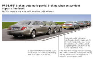 The newly developed PRE-SAFEŽ brake system improves this preventative occupant protection even further. This unique system automatically brakes the CL-Class before an impending accident and operates in tandem with the Brake Assist PLUS (BAS PLUS) system introduced last year, which warns the driver of an imminent rear-end collision with visual and audible signals and automatically calculates the required braking pressure to prevent an accident. This braking-power support is available as soon as the brake pedal is operated. The PRE-SAFEŽ brake system goes one step further: if the driver does not react to the BAS PLUS warnings, the PRE-SAFEŽ brake system triggers automatic partial braking where an accident is imminent and slows the CL-Class down at a rate of up to 0.4 g (around 4 m/s˛), corresponding to around 40 per cent of the total braking power. In addition to the visual and acoustic warning, the automatic partial braking provides the driver with another clear warning to act. If the driver then immediately applies the brakes, the maximum braking force is available and the accident can - depending on the situation - be averted at the last moment. If an accident is unavoidable, the PRE-SAFEŽ brake system reduces the impact severity and, in turn, the risk of injury to the vehicle occupants. The anticipatory PRE-SAFEŽ measures on board the new Mercedes coupé are also activated automatically when the PRE-SAFEŽ brake system goes into action. As soon as the system commences automatic partial braking, the supporting bolsters in the dynamic multi-contour seats are inflated and the front passenger seat is moved to the most favourable position. As with Brake Assist PLUS, the new PRE-SAFEŽ brake system also utilises state-of-the-art radar technology to scan the situation in front of the car and detect a potential accident. Two short-range radar sensors with a range of 30 metres and a scanning angle of 80° are located behind the front bumper fascia on the CL-Class. The additional long-range radar in the radiator grille has a range of 150 metres. Accident severity reduced by 40 per cent Mercedes-Benz has conducted extensive tests on the effectiveness of the new PRE-SAFEŽ brake system. In the DaimlerChrysler Research driving simulator in Berlin, Mercedes engineers conducted a series of tests with 70 drivers who were deliberately distracted by an accident on the opposite carriageway during their journey, while the traffic ahead of them suddenly braked at the same time. The results of these tests demonstrate the increased safety made possible by the state-of-the-art support systems in the CL-Class: thanks to the rapid reaction of the drivers and the help of BAS PLUS with the PRE-SAFEŽ brakes, an accident was avoided during 70 per cent of these journeys. In one-third of these simulator tests the participants were unable to prevent an accident. In these cases the automatic partial braking function ensured a reduction of around 40 per cent in impact severity. Mercedes-Benz also offers the PRE-SAFEŽ brake system in conjunction with the optional DISTRONIC PLUS proximity cruise control and the BAS PLUS braking assistant. (Aug 14, 2006)