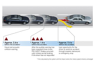 In other words, PRE-SAFEŽ gives the car reflexes. When danger is detected, the new CL-Class responds as reflexively as a living being and activates the appropriate protective measures to avoid the risk of injuries or reduce their severity. This Mercedes invention is in line with the findings of accident researchers, which show that more than two-thirds of all serious accidents are preceded by critical driving manoeuvres that allow an impending collision to be predicted in advance. In the new CL-Class, PRE-SAFEŽ uses this advance accident detection phase, which can have a duration of several seconds in some cases, to: