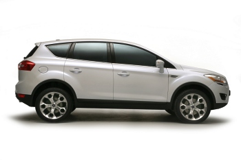 Adopting many of the styling cues from Ford's iosis X Concept, and finished in the same unique "Ice White" body colour with the bold wheel arches filled with the same 19 –inch alloy wheels, the Kuga has poise and presence. The athletic look is highlighted by bold features such as the trapezoidal front grills, rising belt-line and kick-up of the rear window graphic and the dramatic swept back headlamp shapes. For the production Ford Kuga the roof profile of the iosis X Concept has been adjusted to a slightly higher silhouette offering comfortable accommodation for five people. Practicality is a key attribute and the luggage compartment is accessed via a split tailgate. Together with the divided rear lights this ensures the maximum full load width is available for loading and unloading.