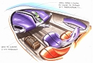 On the other hand, the surfaces that clothe these proportions are simple and clean, resting on three longitudinal ribs, one at the centre and two at the sides, which incline inwards like the canvas wings of a biplane. The central rib creates a "spinal cord" effect that runs from the double chevron of the nose, through the cabin to the rear, almost harking back to a "bateau" body with a shape like a ship's poop. The side is deliberately smooth, with no additional movements or sculpted elements that would spoil or interrupt it. Smooth surfaces, a slightly pointed nose and sides descending towards the rear are typical features of the DS and SM, the models taken as paragons of modern Citroën design. The nose has a rounded section which links smoothly up with the upper and lower parts of the car. The air intake is symbolised by the narrow slits that start from the Citroën logo at the centre of the car. A second air intake is camouflaged in the lower part, in the best brand tradition. The continuous, rounded surface of the nose conveys an impression of protection and softness rather than cutting aggressiveness. The triangular light clusters accompany the logo and underline the longitudinal lines of the car's structure. The windscreen emerges from the wide, short bonnet, with a continuous cut up to the roof. The edge of the window terminates with a slit that supplies the engine air intake. The continuous horizontal surface of the roof tapers off in the plan view, to create a sharp vertical volume that is another strong point of the car. The air outlets of the engine bay are built into the roof surface, continuing the arrow shaped cut of the windscreen, and reiterating the chevron motif in the plan view. Another characteristic strong point is the treatment of the rear volumes where the tapered cabin creates two large surfaces which widen towards the rear and link up to the roof. In the three-quarters view, the "crest" of the cabin and the large, rear mounted wings are much in evidence. To allow access to the interior, the entire superstructure of the cabin is lifted up by a hydraulic system activated by remote control. The interior conveys the same philosophies: pioneering flight, the materials, the central spinal cord. The three passengers are seated in a triangle to make better use of transverse space. Because it is a pure sports car, the central role of the driving position is emphasized both physically and ideally. The driver is seated on a very essential shell anchored to the car. The steering wheel and pedals are both adjustable. The offset side seats are treated "mimetically" compared to the rest of the environment. The facia is made of a tubular element that crosses the car, on which the functional elements are clustered. A textile surface, a sail or a wing, is stretched on this structure, visibly reiterating the entire design philosophy. One precise condition of the project was the complete break between the architecture of the OSÉE and that of any other Citroën of today. As a result, the chassis was built specifically, integrating two fundamental elements of Citroën:
