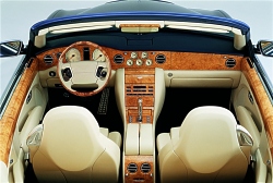 The twin-turbocharged V8 engine, double-wishbone suspension and extremely rigid body structure of the Arnage provide a state-of-the-art basis for the new Azure. It is powered by a 450bhp (336Kw) version of the Arnage’s 6.75-litre twin-turbocharged intercooled V8 engine and produces 875Nm (645lb ft) of torque. The specification of the production version of the Azure is virtually unchanged from the original L.A. show car. The principle change is the introduction of high technology, lightweight, carbon fibre, under-floor cross braces that contribute to the exceptional levels of body stiffness, benefiting refinement, ride and handling. In addition, the chrome trimmed bumpers and sills of the show car are now painted in body colour with a delicate chrome trim that runs the length of the car, enhancing the flowing lines of the Azure body. |