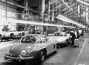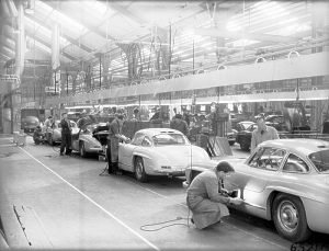 Although there were initially no plans to send the 300 SL into series production, the Daimler-Benz Board had been left with the words of Maximilian (“Maxi”) Hoffman ringing in their ears. The official importer of Mercedes-Benz cars into America campaigned tirelessly for a sports car to offer his well-heeled clientele, and the 300 SL racer fitted the bill perfectly. After lengthy deliberations, the green light was given for series production of the road-trim 300 SL (W 198), as well as a smaller, open-top sports car, the 190 SL (W 121). The two models were due to celebrate their premieres less than six months after the Board had granted the project their approval.