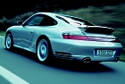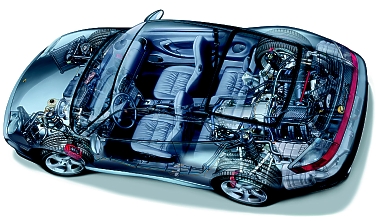 The engine cover on the 911 Carrera 4S has been matched to the wider rear end and, unlike the other 911 models, is made of glass-fiber reinforced plastic. This material is frequently used in Porsche's motor sport activities and gives the designers and development engineers more freedom at the design stage. At the lower edge of the rear flap is a red light strip providing a visual link between the two rear lights. Another distinguishing Carrera 4S feature is the rear spoiler, adopted from the 911 Carrera, which extends automatically at 120 km/h for safe road behavior at high speeds. Like the rear cover, the front end with its three characteristic dark-trimmed air intake openings has been taken from the 911 Turbo, but modified slightly: Raising the spoiler lip in the center adjusts front axle lift so that optimum´aerodynamic balance between axle lift forces is obtained. Maximum speed: 280 km/h Compared with the Carrera 4, the weight has gone up slightly, resulting mainly from the wider rear end and more powerful brake system. However, this has only a minor effect on the thrust available from the 370 Nm, 235 kW (320 bhp) 3.6-liter Boxer (flat-six) engine, which accelerates the car from a standstill to 100 km/h in 5.1 seconds and gives it a top speed of 280 km/h. Despite this vast power output and the high, flat torque curve, fuel consumption according to the EU standard test method is 11.4 liters per 100 kilometers, an improvement of more than seven percent compared with the previous 993-series model with 210 kW (285 bhp) rear engine. This significant reduction in fuel consumption from the six-cylinder engine is mainly due to VarioCam Plus, which Porsche developed initially for the 911 Turbo, but which is now, with suitable settings, also used on naturally-aspirated engines in other 911 models. This system, which adds a valve lift changeover device on the inlet side to the "VarioCam" variable inlet camshaft system, consists of movable bucket-type tappets, which are actuated by an electrohydraulic 3/2-way valve. Different cam profiles are provided on the inlet camshaft, and brought into action with the corresponding valve lift values by repositioning the tappets. One could say that VarioCam Plus makes two engines out of one: the first has low valve lift and is ideal for city traffic and part-loads. The second engine, with greater valve lift, supplies three times as much torque within a fraction of a second and is designed for top performance. The 3.6-liter flat-six 'Boxer' engine has four oxygen sensors in the exhaust system - one control and one diagnostic sensor for each cylinder bank. Together with secondary air injection, modern catalytic converter technology using metal monoliths enables the 911 Carrera 4S to comply with exhaust emission limits worldwide, including the EU 3 standard, which has been in effect since January 1, 2001, and the demanding LEV standard Reliable traction The Carrera 4S has four-wheel drive as a standard in both the six-speed manual-gearbox and Tiptronic S versions. With four-wheel drive including a multi-plate viscous coupling clutch in the driveline, the front wheels apply a constant minimum of five percent of total tractive force to the road, but up to 40 percent if more is needed. Rather than ultimate traction, the emphasis is on supreme behavior and safety. In conjunction with four-wheel drive, the "Porsche Stability Management" (PSM) electronic dynamic driving control system makes driving particularly safe and is also standard equipment.